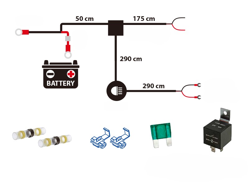 Relejohtosarja, joka on suunniteltu Optibeam Super Captain Rage tai Dual 800- lisävalon asennukseen. Sarja sisältää kutisteliittimet sekä 12V ja 24V releen. Relejohtosarjassa on reilusti johtoa (kts. kuva), joten se sopii myös isommankin ajoneuvon käyttöön! Johtosarjassa on erillinen katkaisija.