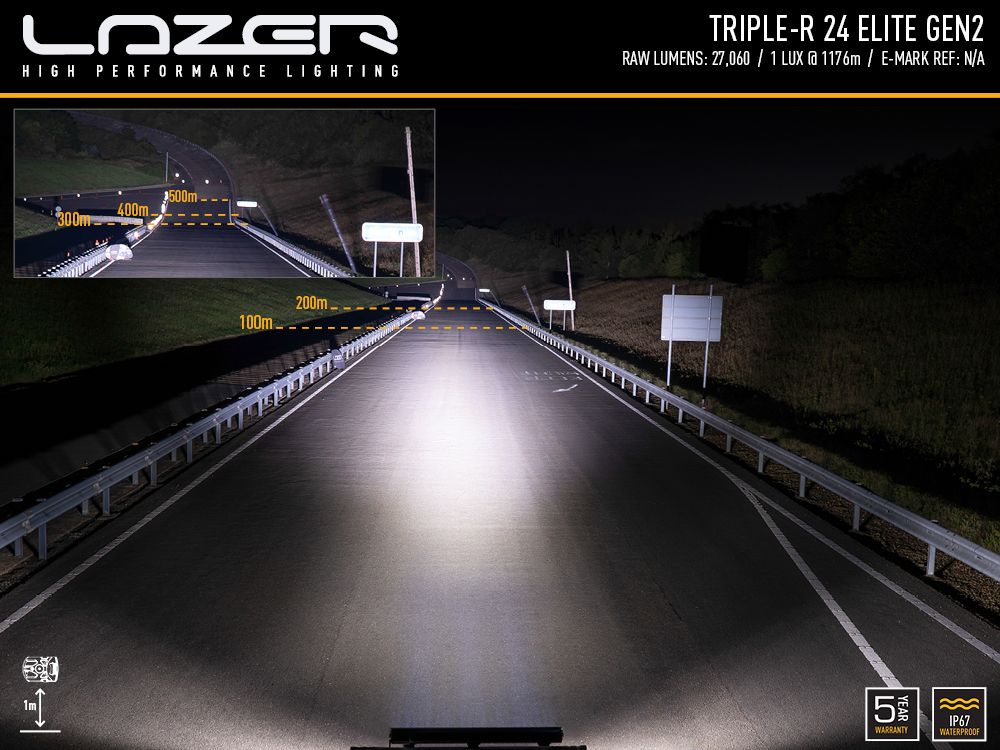 Lazer Triple-R 24 Elite Gen2 on huipputehokas lisävalopaneeli, joka hyödyntää viimeisintä LED- ja heijastintekniikkaa ja on suunniteltu erityisesti Off-Road-käyttöön. Tämä valaisin ei ole tieliikennekäyttöön hyväksytty, vaan se on tarkoitettu asennettavaksi ralliautoihin tai muihin ajoneuvoihin, joita käytetään tieliikenteen ulkopuolella. Triple-R 24 Elite Gen2 tarjoaa huikean 27060 lumenin valotehon ja 1176 metrin kantaman (1 lux), mikä on erinomaisen pitkä kantama tämän kokoluokan valolle.